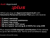 Adaptive cruise control, Advanced driver attention and fatigue montior, Audi application store, Audi assistant, Audi connect emergency call and service, Audi drive select, Audi smartphone interface, Audi virtual cockpit plus with 11.9"OLED colour display, Automatic start/stop system with coasting functionality, Camera based traffic sign recognition, Intersection assist, Lane departure warning, MMI navigation plus with high resolution 14.5"OLED touchscreen colour display, Park assist plus, Parking system plus with 360 display, Progressive steering with servotronic, Rear view camera, Swerve assist and turn assist, Traffic sign based speed limiter, Sports suspension lowered by 20mm, 2 USB-C ports in both the front and rear, Audi sound system impressive sound with 10 loudspeakers including centre speaker and subwoofer, 6-channel amplifier with a total output of 180 watts, DAB digital radio reception, Smartphone compartment with wireless charging, Aluminium roof rails, Aluminium window trims, Auto dimming rear view mirror, Body colour door mirrors, Door mirrors - electrically adjustable, heated, folding and auto dimming on both sides, Front and rear electric windows, Front door sill trims with aluminium inlays, illuminated with 'S' logo, High beam assist, LED headlights Plus incl. digital daytime running lights, turning light, all-weather light, motorway light, manouevring light and intersection light, LED rear lights pro incl. dynamic rear indicators and illuminated light strip with animated coming and leaving home function, LED third brake light, Privacy glass, Rear and side windows with heat insulating glass, Rear side wing doors, Rear wash/wipe, S Line badges on the front wings, S line bumpers, radiator grille and diffuser in phantom black and diffuser insert in matt anthracite, White rhombus logo projection light in exterior mirrors, Windscreen with acoustic glazing, 3 rear headrests, 3 seat rear bench, 3 spoke leather steering wheel with multi-function buttons with touch control, flattened on top and bottom, with S badging and contrast stitching, 3-zone automatic climate control, 40:20:40 split folding rear seat bench with centre armrest and cup holders, Comfort front centre armrest, Front and rear floor mats, Front seats with manual adjustment for position and 4-way electric lumbar support, Front sport seats with integrated headrest and S embossed logo, Headlining in black cloth, Heated front seats, i-Size child seat mounting on the front passenger side and outer rear seats, i-Size and top tether on the outer rear seats, Luggage compartment lid, electrically opening and closing, Manual steering column height and depth adjustment, Single front passenger seat, Stainless steel pedals and footrest, Steering wheel grips in perforated leather and shift paddles, Ambient lighting package plus - A5, 3x3 point rear seat belts, Driver airbag, Electric child safety locks, First aid kit with warning triangle and vests, Front emergency brake assist, Front passenger airbag, Front passenger airbag deactivation, Front side airbags with head airbag system and front interaction airbag, Hill hold assist, Seat belt monitoring with rear seat occupant reminder, Tyre pressure loss indicator, Anti theft alarm, Anti-theft wheel bolts, Keyless Go, Accent surfaces and control buttons in gloss black, Black dashboard with contrast stitching, Inlays in matt brushed aluminium with linear embossing, anthracite, Softwrap in leatherette with contrast stitching, Upper and lower interior elements in leatherette, Tyre repair kit,