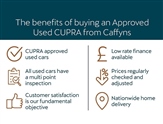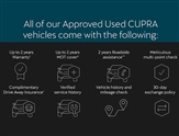 Digital cockpit and configurable dashboard, Driver alert system, Driving profile selection, Forward collision warning with automatic braking, Lane assist, Park assist (inc front/rear parking sensors), PAS, Predictive adaptive cruise control with speed limiter, Rear view camera, RPM, trip computer, outside temp gauge, instrument light brightness, low fuel warning light, lights on reminder, gearshift indicator, Service interval indicator, Start/stop system with regenerative braking, Wireless apple carplay, Wireless phone charger, Electronic locking differential and dynamic traction support, Standard suspension, 2 front and 2 rear USB type C sockets, Auxiliary input socket, DAB radio, Auto dimming rear view mirror, Body colour door handles, Body coloured bumpers, Dark grey wing mirror, Daytime running light with automatic headlight control and coming home feature, Dynamic headlight range control, Electric front/rear windows, Electrically adjustable heated and folding door mirrors with memory function, Front fog lamps with cornering function, Gloss black roof rails and window surrounds, LED Headlights, LED Taillights with dynamic indicator, Rain sensing wipers, Rear diffuser with black simulated exhaust pipes, Rear wash/wipe, Tinted rear windows, Welcome lights, 12v power supply in centre console, 12V socket, 12v socket in loadspace, 2 front and 2 rear reading lights, 230V socket, 60/40 split rear bench seat with armrest and mechanical seat release, Dust/pollen filter, Front and rear head restraints, Front centre armrest, Height/reach adjust steering wheel, Illuminated interior front door sills, Illuminated sunvisor with mirror, Isofix, Leather multi function heated steering wheel with gear shift paddles, Luggage tie-down hooks, Three zone climate control with control panel in rear, Variable luggage/load compartment floor, Wraparound lighting, Genuine Nappa leather Pack - Cupra, Navigation system pack with 10"navigation system - Formentor, 3 point seatbelts on all rear seats, ABS, Brake control system - ESC and brake booster, Child proof door locks, Driver and front passenger airbags with front passenger airbag de-activation, Electronic parking brake, Front and rear disc brakes, Front side curtain airbags, Hill hold control, Seat belt reminder for front and rear seats, Tyre pressure monitoring system, Anti theft alarm system, Keyless entry and start system (KESSY), Locking wheel bolts, Copper and aluminium interior detailing, 19"'Exclusive' machined sport matte black and silver alloy wheels,