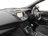 Apple car play/Android Auto, Enhanced active park assist including perpendicular parking pull out assist, flank guard and front/rear parking sensor, EPAS, Hands free telephone, Trip computer, Sports suspension, 2 USB ports, Auxiliary socket for external device, Remote audio controls on steering wheel, Auto dimming rear view mirror, Black mirror caps, Body colour bumpers, Body styling kit - Body colour front/rear/side skirts, door claddings, wheel arches, high gloss black rear mesh, silver skid plate and rear diffuser, Electrically operated and heated door mirrors with side indicators, Electrically operated front and rear windows with global closing, Front fog lights, Front scuff plate, Large rear spoiler, Power folding door mirrors, Power opening panoramic glass sunroof, Quickclear heated windscreen, Rain sensing wipers, Tailgate wash/wipe, Twin exhaust pipes, 6 way manually adjustable passenger seat with lumbar support, 60/40 split/folding rear back and cushion, Alloy Foot Pedals, Auxiliary power socket in luggage area, Centre console with stowage tray/bottle holder/CD stowage/front and rear 12V power point, Dark headliner, Driver/passenger front seatback pockets, Dual electronic automatic temperature control, Flat bottomed leather steering wheel with red stitching + gear knob, Floor mats with red stitching, Folding rear centre armrest, Footwell courtesy lights front and rear, Front head restraints, Front overhead courtesy lights with theatre style dimming and delay, Front/rear reading lights, Isofix system on outer rear seats, Multi-colour ambient interior lighting, Part leather upholstery, Reach + rake adjustable steering column, Rear head restraints, Sports style front seats, Stowage unit in upper instrument panel, Tie down hooks, Tonneau cover, Variable intensity instrument illumination, Appearance pack - Kuga/ST-Line, 3 point seatbelts on all 3 rear seats, ABS/EBD, Airbags - front driver/passenger, front & rear side, curtain, drivers knee, EBA, Electric traction assist system, Electronic Stability Programme, Front passenger airbag deactivation switch, Hill start assist, Intelligent all wheel drive system - Active Driveline, Intelligent Protection System (IPS), Red brake calipers, Tyre pressure monitoring system, Engine immobiliser, Keyless entry, Keyless start with 'Ford Power' starter button, Locking wheel nuts, MyKey system, Remote powered central double locking doors, Thatcham category 1 alarm, 19"5x2 rock metallic alloy wheels, Mini steel spare wheel,
