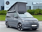 Advanced driver attention and drowsiness monitor, California on tour app, Digital cockpit pro, Discover Pro Navigation system, Driving profile selection, eCall emergency system, Emergency assist, Function control unit, IDA voice assistant and voice enhancer, Lane keeping system Lane Assist, Mobile phone interface, Multifunction camera, PAS, Preparation for online services, Tailgate with window aperture and with power latching, Traffic sign recognition, Turn assist with evasive assistance, Volkswagen wired and wireless app connect, Additional batteries 2nd and 3rd with voltage transformer NV, Battery without capacity specification, Standard battery/generator, Standard suspension and shock absorption, 2 USB-C ports at the front, 4 USB-C charging sockets in the passenger compartment, 8 Speakers, Digital radio reception (DAB), 3rd brake light, 65% light absorbing privacy glass, Dynamic Light Assist for LED matrix headlights, Electro hydraulic elevating roof, with three windows including one front passengers panorama opening, canvas in Basalt Grey, Four speed control for windscreen wipers, Heat and sound insulating laminated safety glass windshield, Heated windscreen, High gloss black door mirrors, Illuminated molding between headlamps, Nameplate set California, Poor weather light including cornering light, Red LED tail lights, Sliding window in front with fly screen in passenger compartment left/right & fixed window in rear in load passenger compartment at left, Windscreen wiper intermittent control, 2 single seats with integrated seatbelt and sleeping mat, 230V external inlet with charging feature for vehicle batteries, 230V inverter with socket on driver seat, Additional interior noise attenuation plus, Ambient interior lighting, Armrest on front swivel seats in both sides with electric lumbar support, Camper parking heater for continuous operation & parking heater for windshield defrosting with radio remote control, Darkening roller blinds and thermo mats, Drawers under the outer seats in the cab and passenger compartment & 2 waste bins, Front and rear headrests, Heated front seats, Heated steering wheel, Kitchen with outdoor folding table for cooking and roof storage box in décor 2, Lockable glove compartment with lighting, Multifunction leather steering wheel with paddle shifters, Plastic floor covering in passenger/load compartment, Single front passenger seat, Surround lighting in door area, Swivel seat on left with height adjustable including drawer, Swivel seat on right with height adjustable including drawer, Advanced assistance pack - California, Top package - California, 2x3 point automatic seatbelts at the rear outside with ECE label, with/without belt tensioner, Autonomous emergency braking front assist with pedestrian and cyclist monitoring, Child locks, Driver and front passenger airbags with front passenger airbag deactivation button, First aid kit with warning triangle and safety vest, Front Assist with pedestrian and cyclist detection, Front disc brakes, Height adjustable three point automatic seatbelts at front with belt and end fitting tensioners, Side and curtain airbags for driver and front passenger, curtain airbags for outer seats in rear, centre airbag in front, Swerve support and oncoming vehicle braking when turning, Tyre pressure loss indicator, Anti theft alarm system with interior monitoring in cab, backup horn and towing protection, Central locking + keyless locking and starting system Keyless Advanced with safe lock, Lockable wheel bolts, Preparation for alcohol interlock, 5+ Promise service plan, Dark silver brushed decorative inlays, Hub caps for alloy wheels, Tool kit,