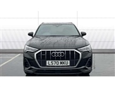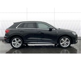 Audi connect safety and service (e-call), Audi drive select, Audi lane departure warning, Audi side assist, Audi Virtual Cockpit - 10.25"display, Bluetooth interface, Camera based traffic sign recognition, MMI Navigation Plus with high resolution 10.1 inch touchscreen colour display, Power operated tailgate, Progressive steering, Service interval indicator, Smartphone interface includes wireless Apple carplay/Android Auto, Start stop system with recuperation, Voice control system with natural language interaction, Sports suspension, 1 x USB type C and 1 USB type A charging points, 6 passive loudspeakers, DAB digital radio module, Acoustic windscreen, Aluminium roof rails, Aluminium window trim, Auto dimming frameless rear view mirror, Body coloured bumpers, Electrically folding, adjustable and heated door mirrors with integrated LED side indicators and kerb view function for passenger side, Front and rear electric windows, Front fog lights, Front side air inlets in matt platinum grey, Front spoiler blade in matt platinum grey, Grille vertical bars in aluminium silver/Matt, High gloss black finish B and C pillars, LED headlights with LED daytime running lights and dynamic rear indicator, LED rear lights, Privacy glass dark tinted rear and rear-side windows (from B-pillar backwards), Rain and light sensors, Rear diffuser strip in matt titanium black, S line badges on front wings, S Line front and rear bumpers, Side skirt insert in matt Platinium grey, Silver chrome grille surround, Titanium black radiator grille, 12V socket in rear centre console, 40:20:40 folding with manual adjustment for 60:40 forwards/backwards position and backrest angle, Adjustable rear seat bench/backrest with centre armrest and cupholder, Black cloth headlining, Dual zone electronic climate control, Front and rear black floor mats with contrast stitching in rock grey, Front and rear headrests, Front and rear roof module including reading lights, Front centre armrest, Glove compartment lighting, Height and reach adjustable steering wheel, Illuminated door sill trims with S logo, ISOFIX child seat mounting for front passenger with airbag deactivation and outer rear seat including top tether attachment point for outer rear seats, Luggage compartment light, Manual front seats with height adjustment, Perforated leather gearknob, Stainless steel luggage compartment sill finisher, Stainless steel pedals, Non smoking pack - Q3, 3x3 point rear seatbelts, 6 airbags - Driver, front passenger, curtain and side windows, Audi pre-sense front with pedestrain and cyclist recognition, Electrically operated child locks on rear doors, Electromechanical parking brake, Electronic stabilisation control including ABS, ASR and EDL, Hill descent control, Hill hold assist, Pre sense basic, Seatbelt monitoring, Tyre pressure warning, Warning triangle and first aid kit, Anti theft alarm, Anti theft wheel bolts, Remote central locking, Dark matt brushed aluminium inlay, Detail dashboard around MMI touch colour display in glass look, black with surround in aluminium look, Leatherette door armrest,