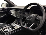10.1"and 8.6"Dual colour touchscreens, Audi connect safety and service (e-call), Audi drive select, Audi parking system plus with front and rear sensors, Audi phone box with wireless charging, Audi smartphone interface, Audi virtual cockpit plus, Automatic start/stop system, Electro-mechanical PAS, Low washer fluid indicator, MMI - Multi Media Interface control system, MMI navigation plus with MMI touch, Natural voice recognition, On board computer, Operating buttons in black, glass look with haptic feedback, Power operated tailgate, Rear view camera, Service interval indicator, Adaptive air suspension, Diesel particulate filter, Audi music interface with 2 USB ports with charge and data functions in the rear, Audi sound system with 6 channel amplifier, 180 watt amplifying capacity and 10 loudspeakers including subwoofer, Aux-in socket, DAB Digital radio, Acoustic windscreen, Audi Beam uses LEDs to project the Audi Sport logo, Audi HD Matrix LED headlights with dynamic front and rear indicators, Auto dimming frameless rear view mirror, Coming/leaving home lighting function, Electric front+rear windows, Electric panoramic glass sunroof, Electrically adjustable/heated/folding/auto dimming door mirrors with integrated LED indications + kerb view function for passenger side, Headlight washers, Heat insulating glass in windshield, LED signature daytime running lights, Platinum grey front spoiler lip and diffuser insert with honeycomb grille in black, Privacy glass - dark tinted rear and rear side windows from B-pillar backwards, Rain and light sensors, Rear wiper, S line side ventilation grille, 3 spoke flat bottomed high multi-function leather sport steering wheel with gearshift paddles, 4 zone deluxe automatic climate control, 4-way lumbar support for front seats, 40:20:40 split folding rear bench seat, Black Alcantara headlining, Comfort front centre armrest, Double sun visor with illuminated vanity mirror on driver and passenger side extendable, Driver and front passenger seat memory function for electrically adjustable front seats, Electric sunblind for the rear side windows and manual sunblind for the rear window, Front head restraints, Front/rear floor mats, Heated front and outer rear seats, ISOFIX child seat mounting for front passenger seat and 2 outer rear seats with top tether child seat mounting for all 3 rear seats, LED interior ambient lighting, Luggage compartment sill protection in stainless steel, Rear centre armrest with 2 cupholders, Rear headrests, Rear seat bench plus, Self-locking centre differential, Stainless steel pedals, Extended leather pack - Q8, Titanium Black Styling Pack - Q8, 3 point seatbelts on all seats, Audi pre sense front, Driver and front passenger, front side and curtain airbags, Electromechanical parking brake, Electronic Stability Control (ESC) including ABS, ASR and EDL, Front passenger airbag deactivation, Hill descent control, Hill hold assist, Predictive pedestrian protection, Seatbelt monitoring, Traction control, Tyre pressure loss indicator, Warning triangle and first aid kit, Anti theft alarm with tow away protection, Anti-theft wheel bolts and wheel loosening detection, Immobiliser, Keyless go with remote central locking, Polished oak trim with grey finish inlay, Tool kit, Tyre repair kit,