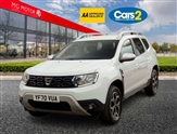 Blind spot monitoring, Bluetooth connectivity, Cruise control, Eco mode, Electric power assisted steering, MediaNav Evolution 7"touchscreen multimedia system with satellite navigation, Apple car play and Android auto, RDS with TMC, siri voice recognition, Multi view camera, On board computer, odometer, trip computer, average fuel consumption, average speed, service indicator, outside temperature gauge, Rear parking camera, Rear parking sensors, Rev counter, Speed limiter, Stop/start system, 4x 20W FM/AM/DAB tuner with steering column mounted fingertip controls, Aux-in socket, USB connection for MP3 players, 3 speed windscreen wipers, Black number plate surround, Black side sills, Black/satin chrome tailgate trim with Duster inscription in black background and lettering, Body coloured door handles, Body coloured front and rear upper section bumpers, Chrome front grille, Dark glass on lateral rear windows, Dark metal door mirrors in grey, Daytime running lights, Double optic headlights, Dusk sensor, Electric adjustable/heated door mirrors, Electric front windows, Electric rear windows, Front and rear black lower section bumpers, Front door sill protection strip, Front fog lights, Heated rear window, High level third rear brake light, LED automatically switched on - In main headlights, Rear wash/wipe, Satin chrome front and rear skid plates, Satin chrome longitudinal roof bars, 3 rear height adjustable headrests, 4 speed heating and ventilation with air recirculation, 60/40 split folding rear seat, Boot light, Climate control, Driver seat lumbar adjustment, Fabric decorative insert on door panels, Front passenger reading light, Front seat armrests, Front under seat storage, Gear shift indicator, Glovebox light, Height adjustable driver seat, Height adjustable front headrests, Height adjustable steering wheel, Isofix points for child seats in both outer rear seats, Map pocket on front seat backs, Matt black front door handles, Matt black rear door handles, Passenger sunvisor with vanity mirror, Rear passenger reading light, Satin chrome gear lever cap insert, Satin chrome lower steering wheel insert, Soft feel steering wheel, 3x3 point rear seatbelts, ABS and Emergency brake assist, ASR traction control with Electronic stability control, Child locks on rear doors, Door open visual and audible warning, Driver airbag, Driver and passenger seatbelt not fastened - visual and audible warning, Front passenger airbag deactivation, Front seatbelt pretensioners, Front side airbags, Height adjustable front seatbelts, Tyre pressure monitor, Keyless entry, Remote central locking, Thatcham approved engine immobiliser, Dark carbon central console surround, Matt black central console fascia, Piano black decorative insert on door panels, Satin chrome air vent surround, Satin chrome instrument dial surrounds, 17"Diamond cut alloy wheels,